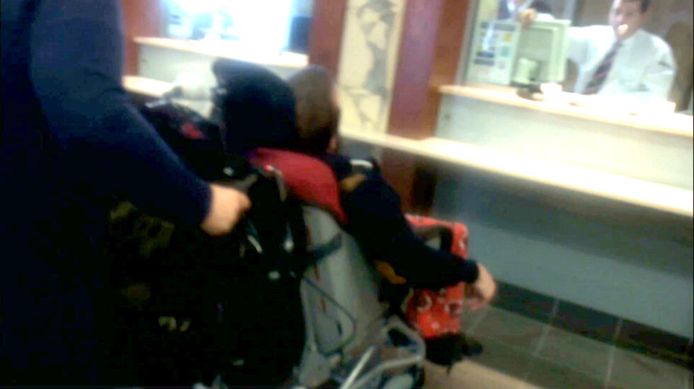 Because of the position he must adopt this wheelchair user is unable to reach the automatic ticket machine or ticket desk at Bath Spa station preventing him being able to journey independently